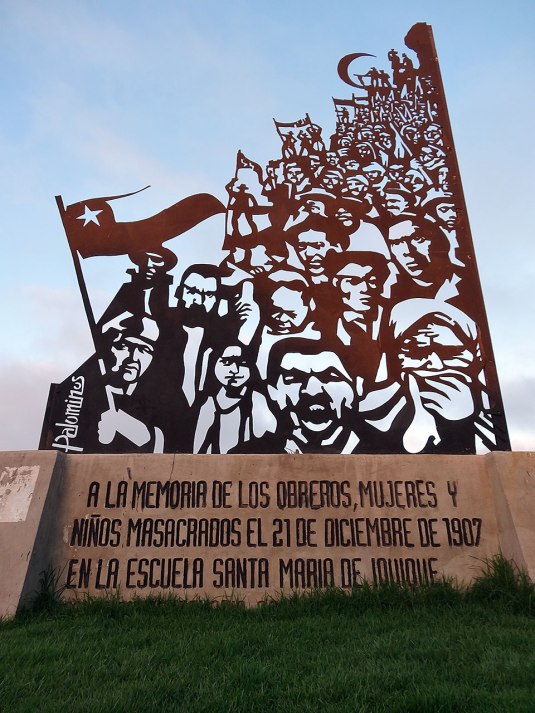 Este memorial recuerda los 100 años de la matanza en la escuela Santa María de Iquique, buscando sintetizar los sentimientos de aquellas personas obreras que lucharon por mejorar su calidad de vida. Fue trabajado en fierro calado de 1 centímetro y pintado a piroxilina.
