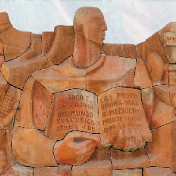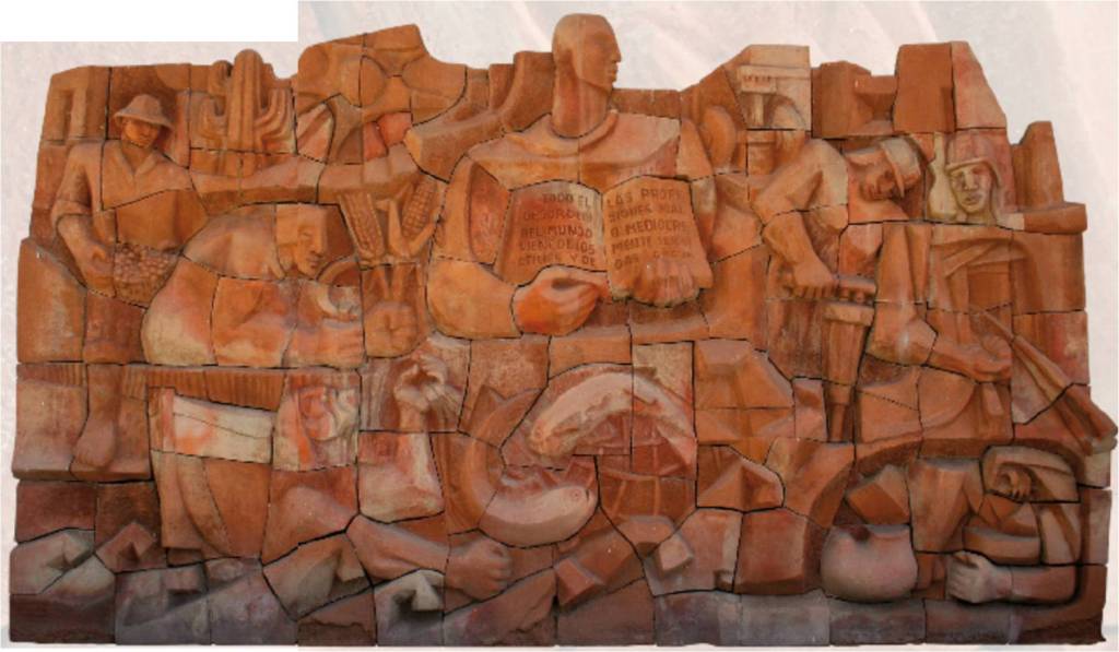 La obra, donde se combinan formas figurativas y semifigurativas, busca simbolizar la relación de la Universidad con el trabajo (actividad productiva) y la cultura de la región. Mide 2,55 metros de alto por 4,7 metros de ancho.