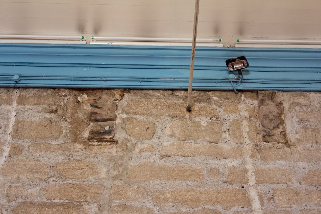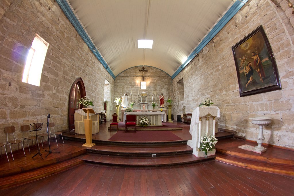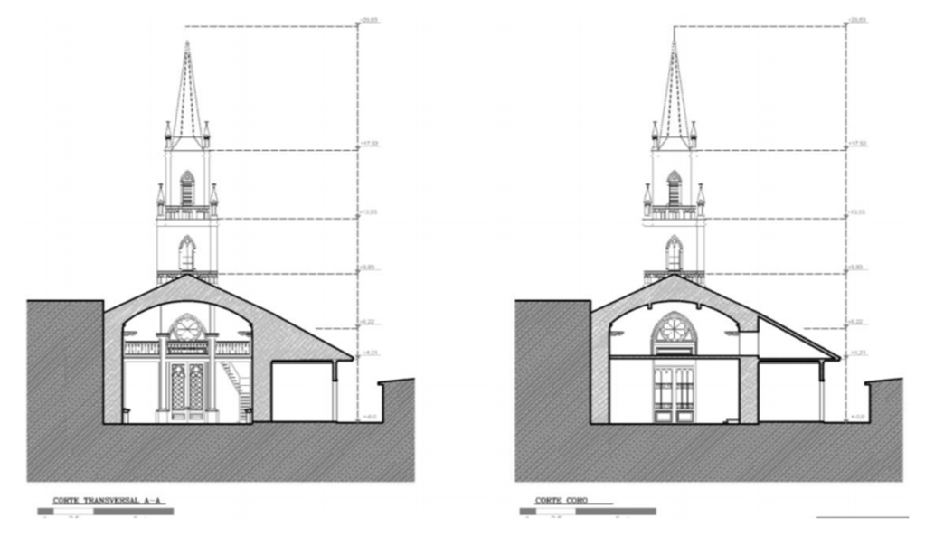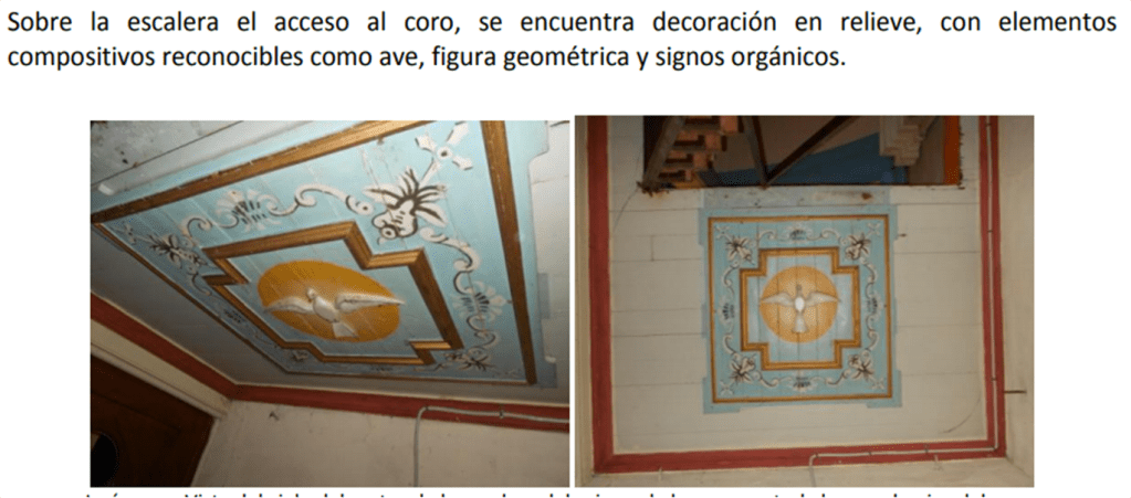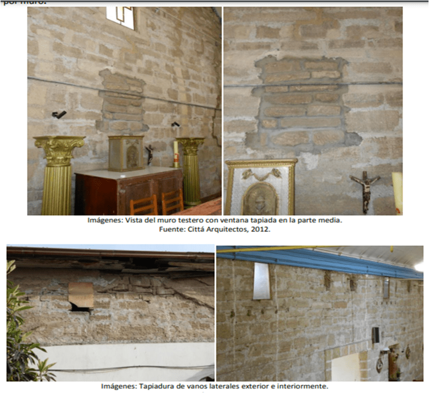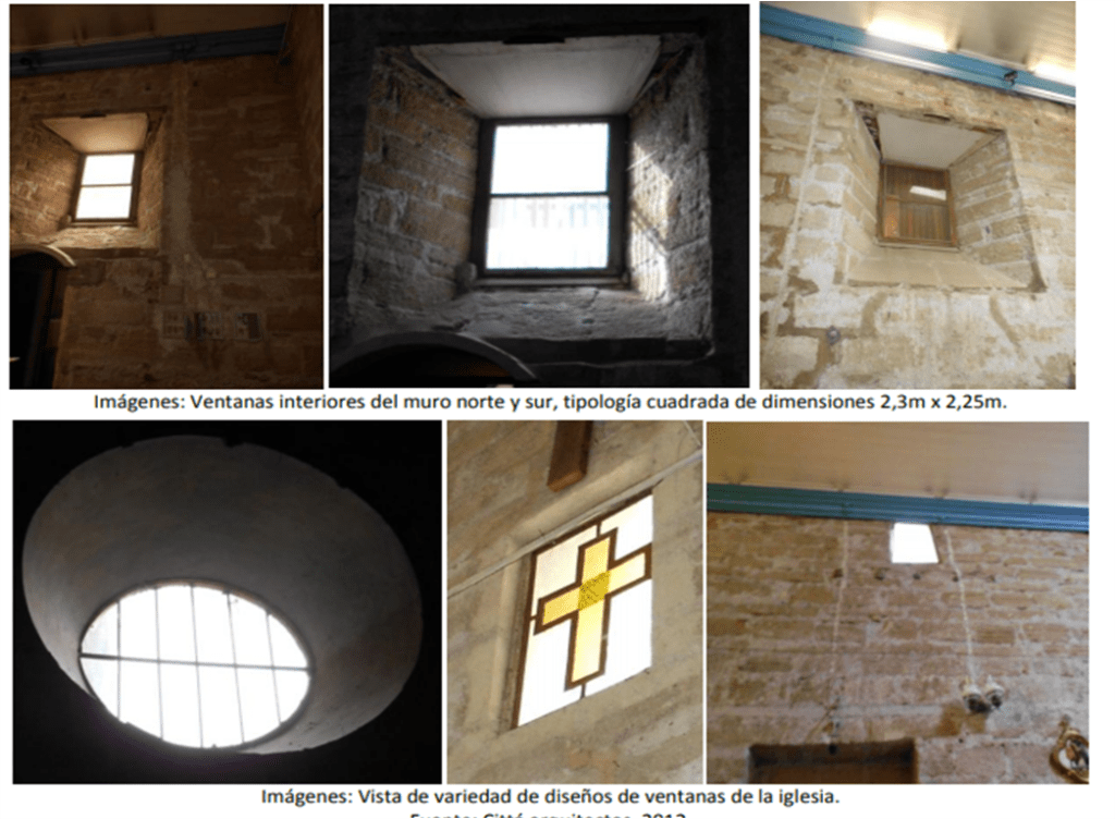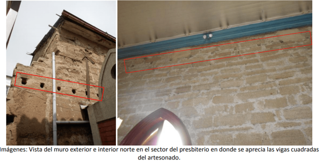 Respecto al muro sur, en su parte superior se encuentran tres ventanas pequeñas tapiadas; cinco vigas y, bajo cada una de ellas, tres pares de vigas cuadradas a una altura de medio muro; tres vigas grandes rectangulares; cuatro pares de vigas de madera rectangulares de cuadria 24”x10”, todas cortadas a ras de muro como vestigio de la estructura de cielo anteriormente utilizada; al medio de estas se ubican cuatro tensores metálicos que cruzan y se anclan en ambos muros, arriostrándolo y comportándose como refuerzo estructural frente a cualquier esfuerzo físico; hay una puerta lateral tapiada donde actualmente se ubica un altar lateral; y un nicho para imaginería. El presbiterio presenta una ventana grande cuadrada de 2,3m x 2,25m, y veinte vigas cuadradas de madera de 3”x3” de crujía y dos tensores metálicos.