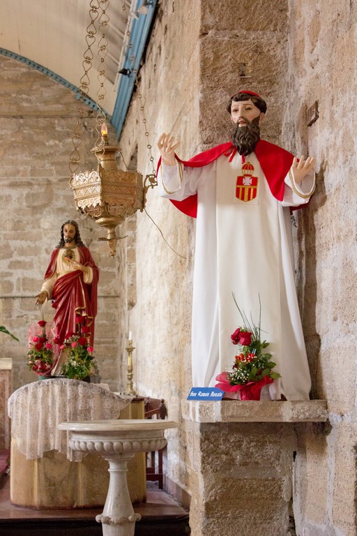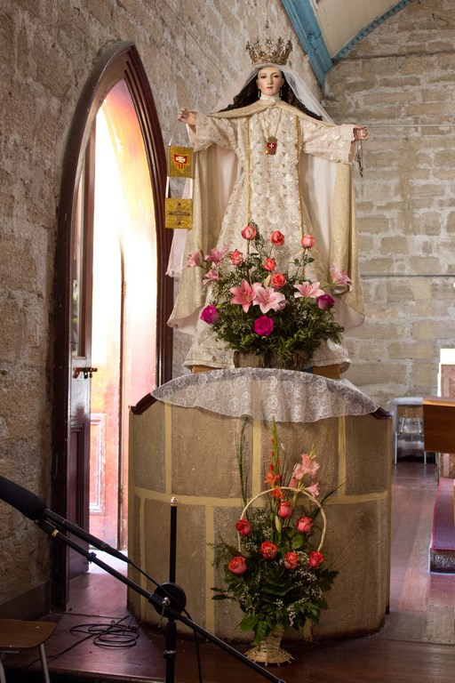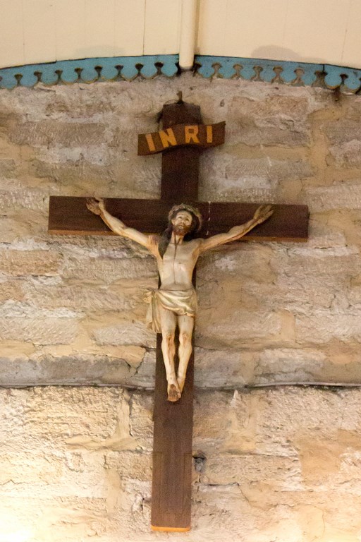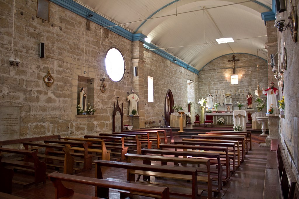 Los pilares de piedra crean, en conjunto con el muro, un solo cuerpo. Se ubica un pilar a cada lado al comenzar el presbiterio. También tiene pilares de madera que son el soporte de la torre y coro ubicados en el área poniente de la iglesia. Se presenta un solo arco en su interior, de estructura de madera y revestidos con entablado de madera. La iglesia es un abovedado de madera con entablado de cielo pintado blanco, con dos tragaluces, uno en la nave principal y otro sobre el presbiterio. Sobre la escalera el acceso al coro, se encuentra decoración en relieve, con elementos compositivos reconocibles como ave, figura geométrica y signos orgánicos.