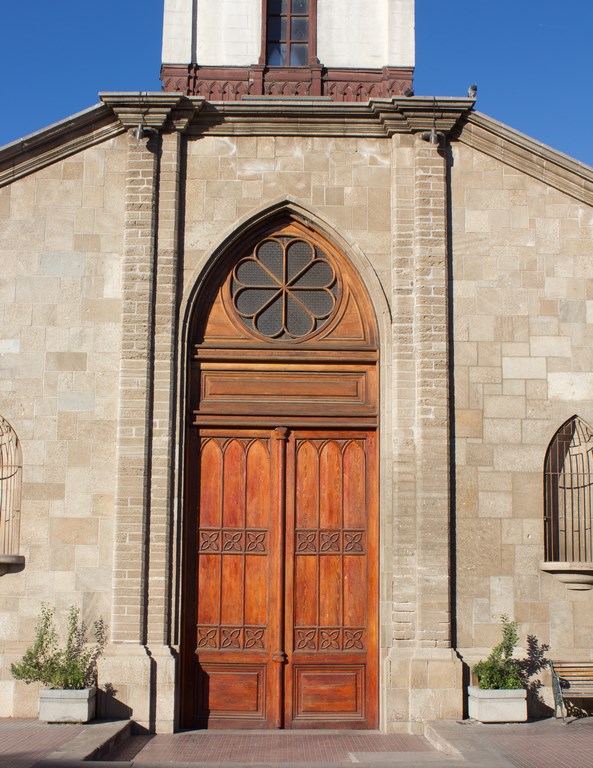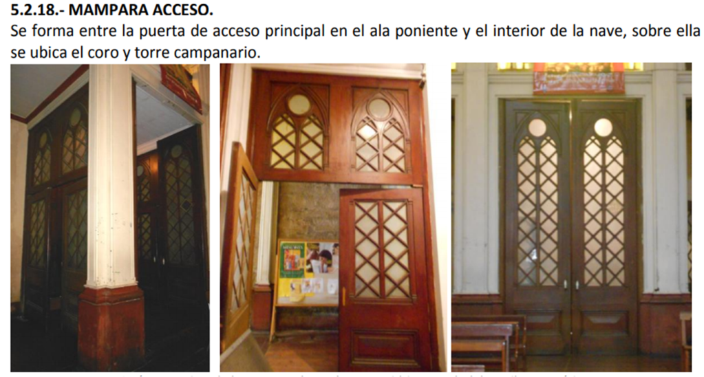 La puerta es de madera con estilo y decoraciones neo-góticos. La mampara de acceso se forma entre la puerta de acceso principal en el ala poniente y el interior de la nave. Sobre ella se ubica el coro y torre campanario. Al interior del inmueble existe diversas tipologías de ventanas, entre ellas encontramos cuadradas, rectangulares y redondas, ubicadas en todos los muros de la iglesia. En la cubierta de la nave central se instalaron dos tragaluces a dos aguas.