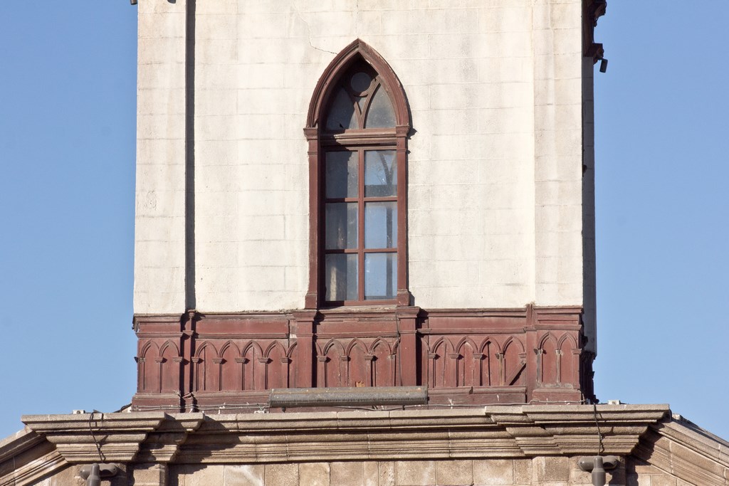 Su materialidad es de piedra tanto en la estructura como en la decoración, con la torre de madera como una de sus caras de fachada. El inmueble exteriormente presenta materialidad de planchas de fierro galvanizado ondulado en la totalidad del techo.