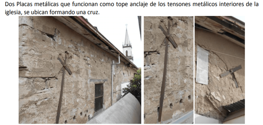 La iglesia presenta por toda en la parte superior siete tensores metálicos, los que tienen la función de arriostrar los muros en caso de movimiento telúricos o fuerza en ellos, estos refuerzos estructurales se colocaron luego que se cortaran las vigas de madera que se encontraban antiguamente como parte de la estructura del techo, hace aproximadamente un siglo atrás.