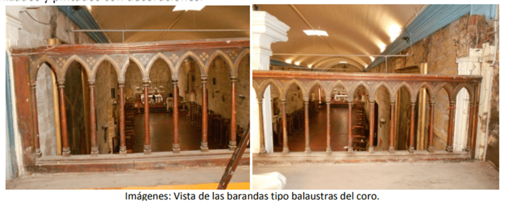 Posee un coro alto ubicado sobre la mampara que separa a modo de vestíbulo el interior del templo, de la puerta de entrada que da hacia la calle, presenta un tensor metálico anclado al muro poniente y empotrado de los muros norte y sur. Las balaustradas del coro son de madera y originales de la iglesia, se unen por arcos tipo apuntado peraltados, barnizados y pintados con decoraciones.
