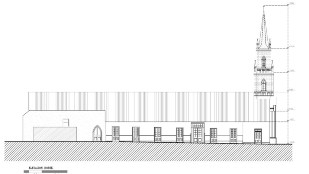 El muro norte presenta tres ventanas pequeñas de dimensiones de 0,7m.x0,6m. en la parte superior del muro, bajo cada una de ellas, hay cinco vigas de madera cuadradas de cuadria de 3”x3”, cuatro pares de vigas rectangulares de cuadria 24”x10”, todas cortadas a ras de muro como vestigio de la estructura de cielo anteriormente utilizada. A 0,46m de altura hay tres nichos donde se colocan imaginerías, una lápida y una ventana circular de 1,15m y vano de 1,9m de diámetro. En el sector del presbiterio se encuentra la puerta acceso a la sacristía, una puerta que da hacia el patio de la iglesia, una ventana rectangular, una ventana cuadrada de dimensión de 1,47m de alto x 1,16m de ancho y vano de 2,29m de alto x 2,24m de ancho, tres ventanas tapiadas en la parte superior, 20 vigas de madera cuadradas de cudria de 3”x 3”, corridas y proporcionales por todo el muro.