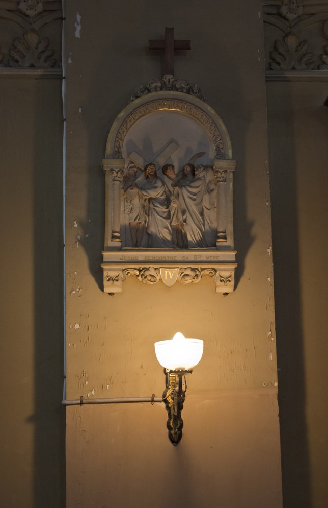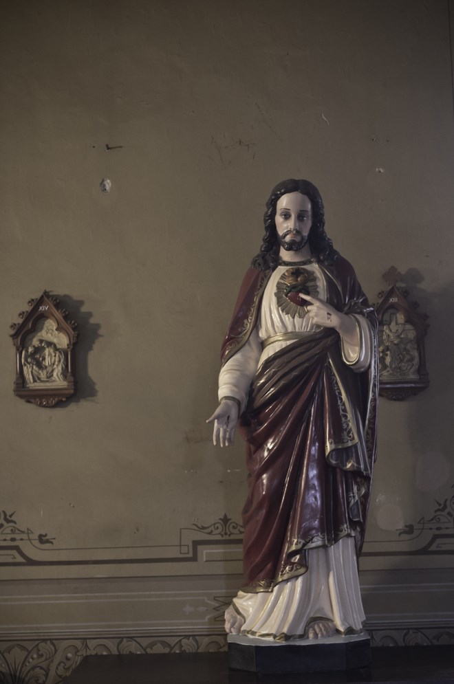 La cornisa precede el antetecho apoyada en ménsulas que se inscriben en el entablamento. A ambos lados del pórtico superior, dos hornacinas contienen las imágenes de San José a la derecha y de San Vicente de Paul a la izquierda. Estas hornacinas están enmarcadas por columnillas corintias que soportan un frontón en segmento de arco. Las pilastras que rematan las esquinas completan la composición de esta fachada de estilo neoclásico. En el interior, las tres naves en cruz están separadas del presbiterio por sendos arcos torales.