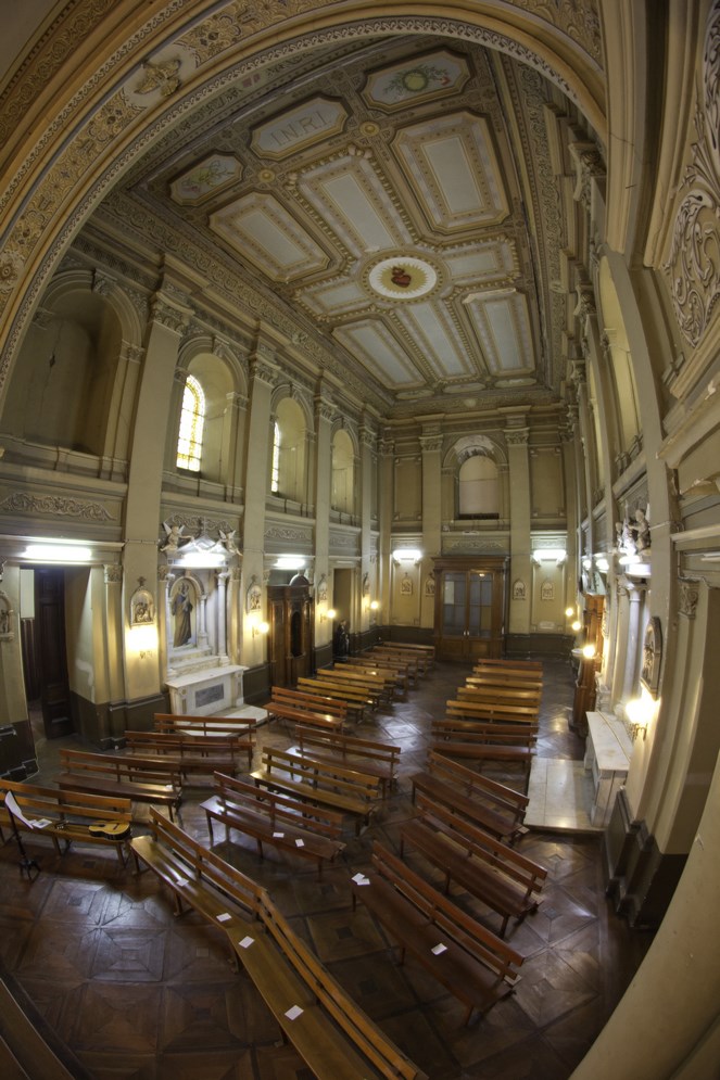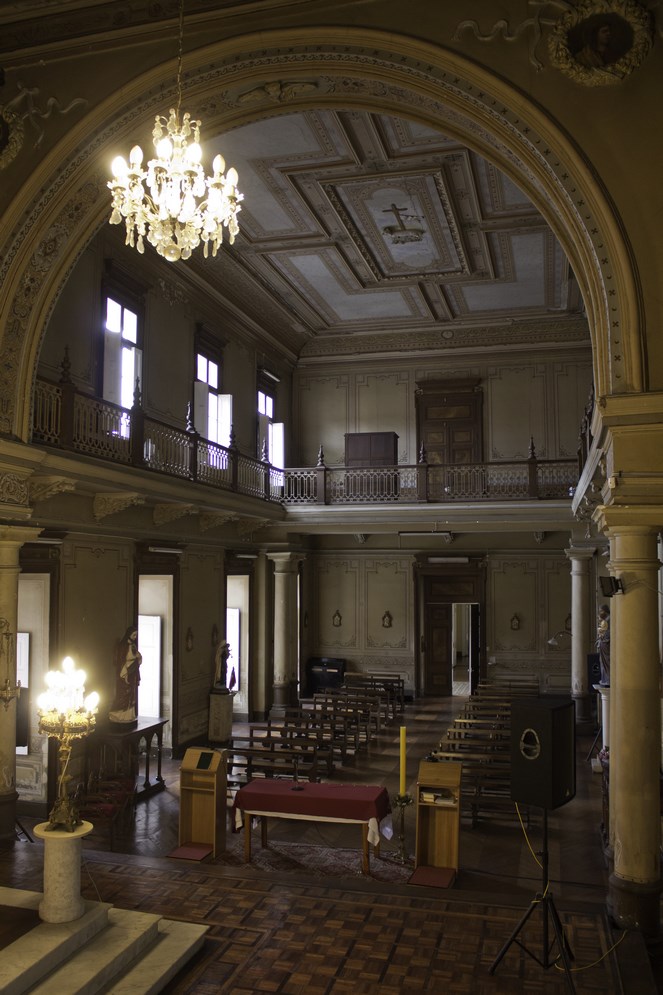 La capilla presenta elementos característicos y únicos, se conservan elementos originales como sus decoraciones tipo murales en pilares, sus altares y sus vitrales. El retablo neoclásico, de columnas y pilastras de mármol rosado, se distingue por su composición equilibrada y serena y por la perfecta ejecución de sus elementos. La capilla carece de coro alto, en cambio, un balcón en volado de artística baranda de fierro recorre a media altura las dos naves del crucero. Este balcón, sumado a las puertas talladas y la fenestración en los dos niveles, configuran una interesante arquitectura interior para estos dos espacios que con sus cuadros. Su fino parquet y su alhajamiento, tienen rasgos de elegantes salas.