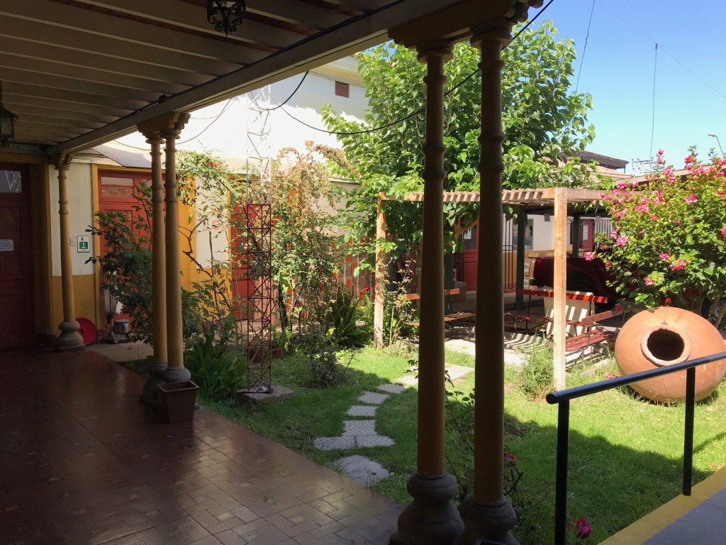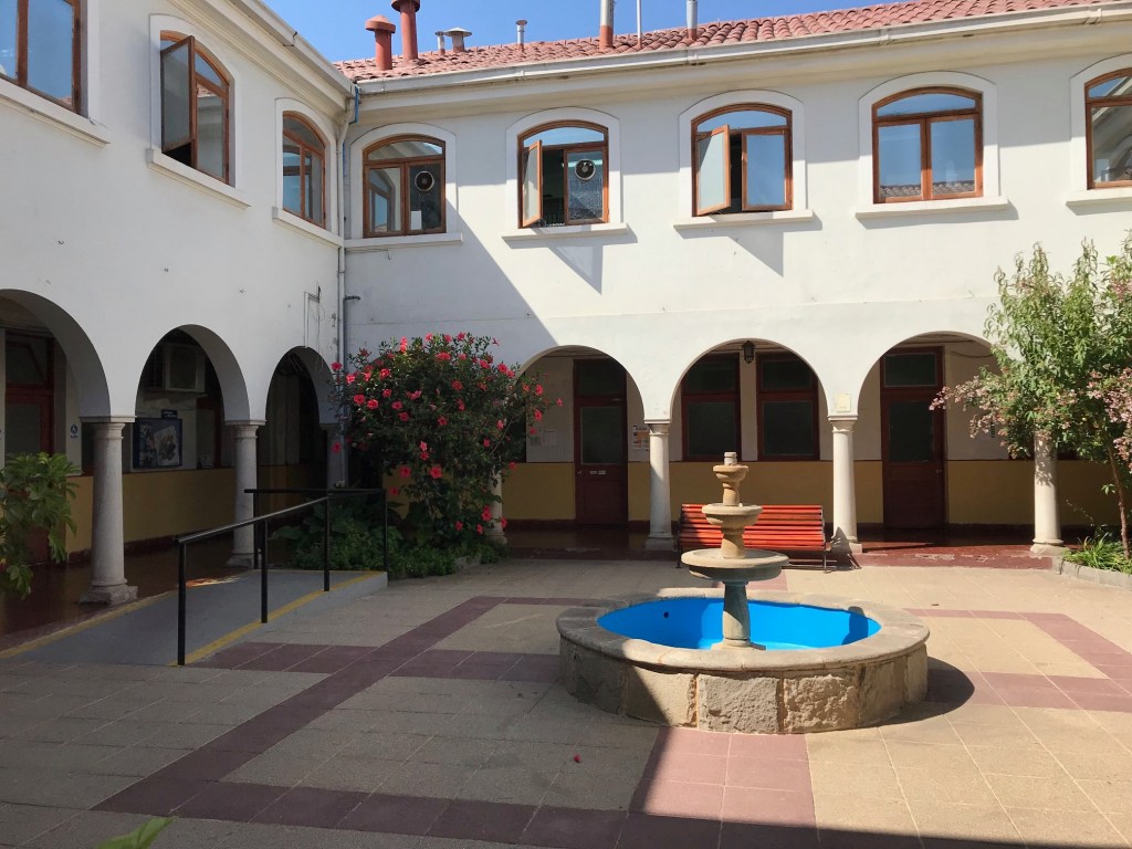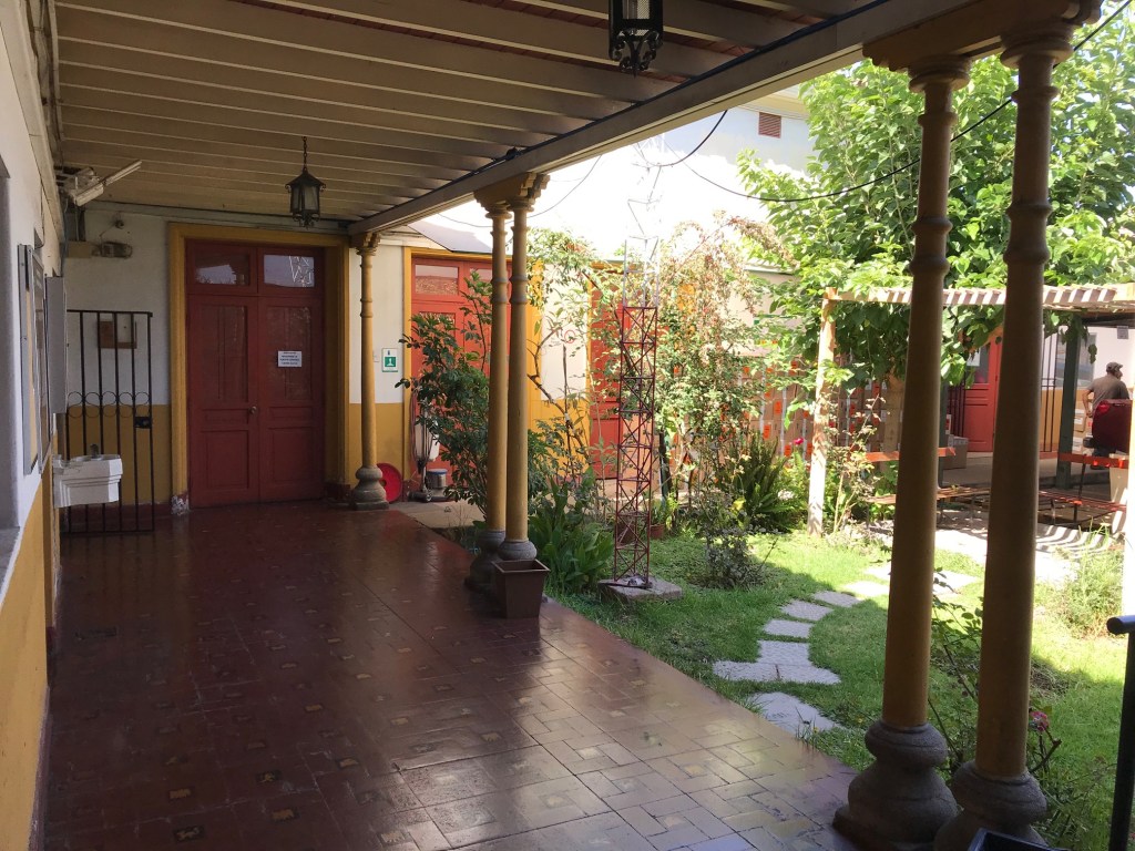 De estilo neocolonial, el inmueble cuenta con un patio principal con arcos, columnas y una pileta central.