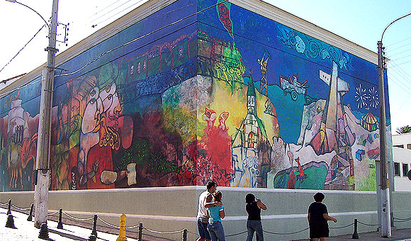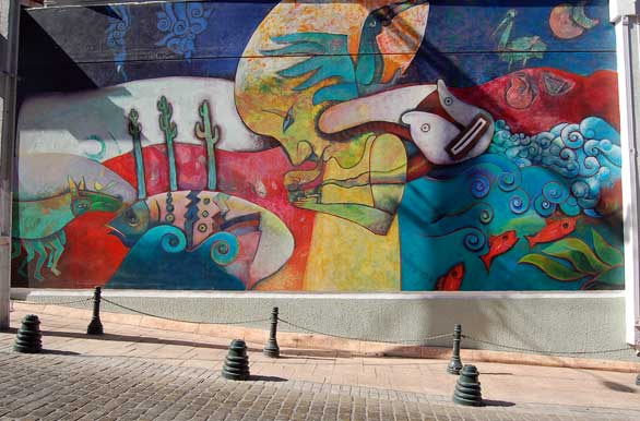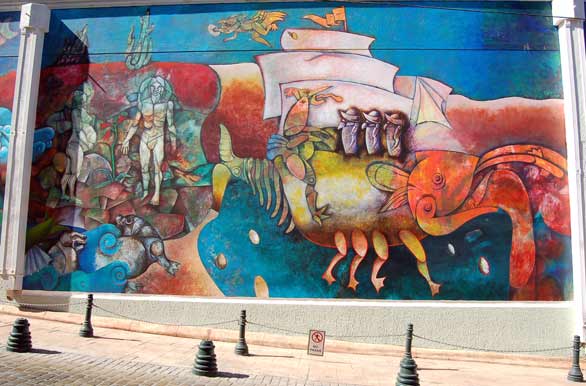 El mural, haciendo una retrospectiva, es una muestra de la historia de Coquimbo y la confluencia e intercambio cultural. En el primer muro se observa la naturaleza donde aparecen los primeros asentamientos humanos. La cabeza humana central representa a la cultura “Las Animas”, pueblo agroalfarero con movilidad en la costa, antecesores de la cultura Diaguita y Changa. En el segundo muro se aprecia una pareja de Changos custodiando la flor de la añanuca, y la llegada de los conquistadores españoles cuya embarcación asemeja un monstruo que devora a los pueblos originarios a su paso.