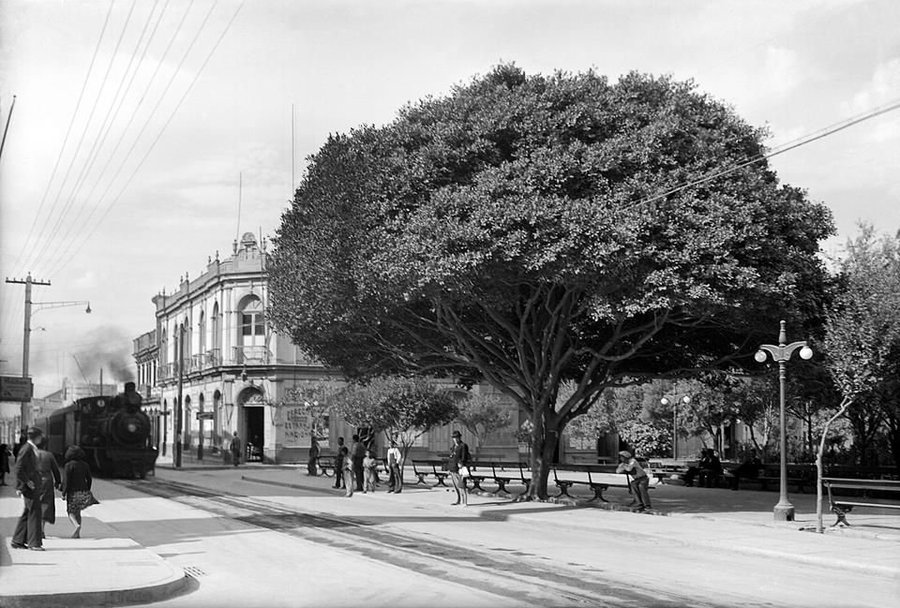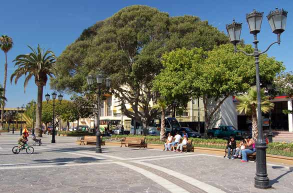 Un elemento característico de la plaza es el gran árbol frente a la Iglesia San Pedro. Es una higuerilla plantada por Inés Chesney Cosgrove, residente escocesa, en 1894. Suele servir de sombra para músicos que reproducen y comercializan su música, generalmente ranchera o tropical, dando música a la Plaza.